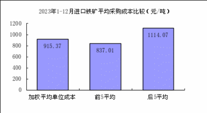 進口粉礦12月份加權平均采購成本1039.60元/噸,環比升高105.01元/噸,升幅為11.24%。1—12月累計平均采購成本為886.23元/噸,同比升高44.94元/噸,升幅為5.34%。