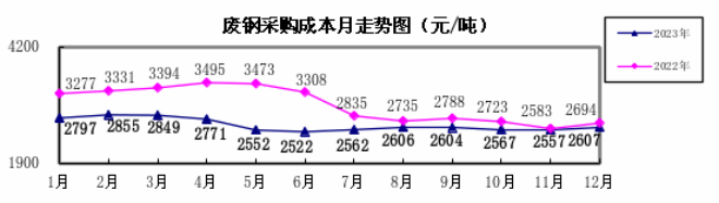 廢鋼12月份加權平均采購成本為2606.80元/噸,環比升高50.21元/噸,升幅為1.96%。1—12月累計平均采購成本為2652.83元/噸,同比下降435.66元/噸,降幅為14.11%。
