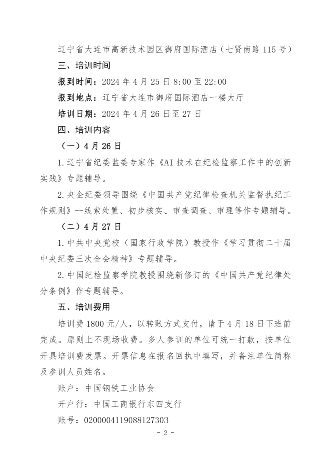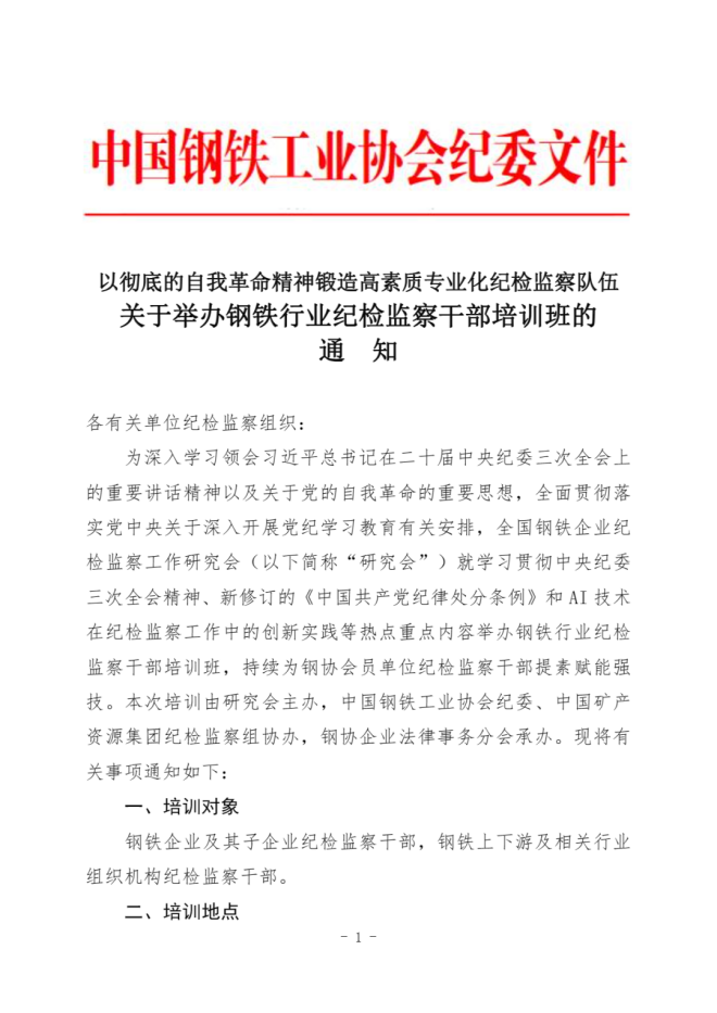 關于舉辦鋼鐵行業紀檢監察干部培訓班的通知