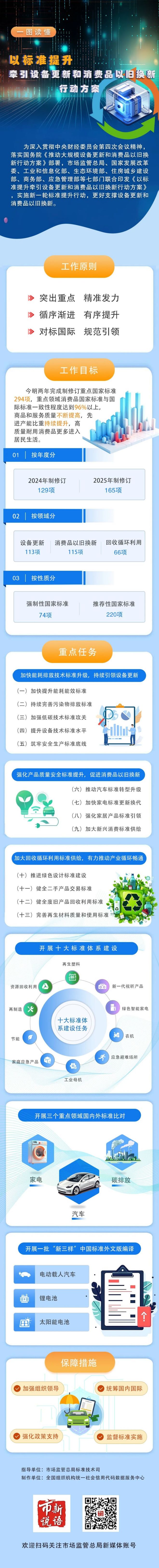 《行動方案》就貫徹落實中央財經委員會第四次會議精神和《推動大規模設備更新和消費品以舊換新行動方案》作出具體安排,提出實施標準提升行動,堅持標準引領、有序提升,強化標準比對、優化體系建設,加快制修訂節能降碳、環保、安全、循環利用等領域標準,到2025年共完成重點國家標準制修訂294項,有力支撐設備更新和消費品以舊換新。