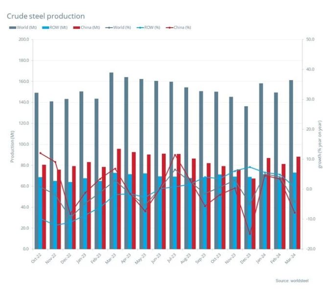 2024年3月全球71個納入世界鋼鐵協會統計國家的粗鋼產量為1.612億噸,同比下降4.3%。