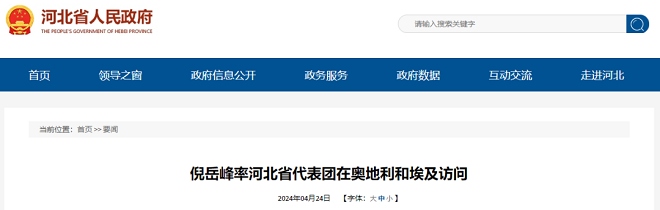 4月24日,河北省人民政府網(wǎng)站發(fā)布了《倪岳峰率河北省代表團(tuán)在奧地利和埃及訪問》一文。