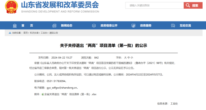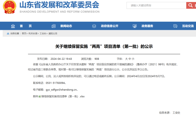 近日,山東省發(fā)改委分別對第一批關(guān)停退出“兩高”項目和繼續(xù)保留實施的“兩高”項目進行公示,公示無異議后予以公告。公示期間,公民、法人或其他組織有異議的,可以通過電話或郵件反映。公示期間:2024年4月22日至2024年5月7日。