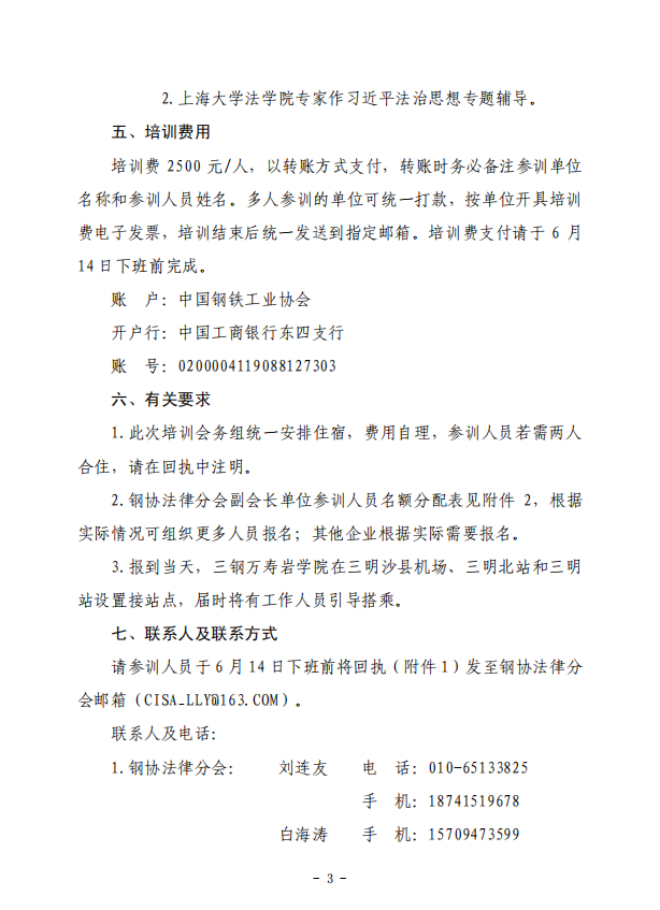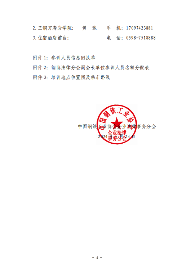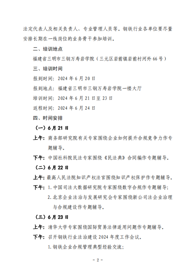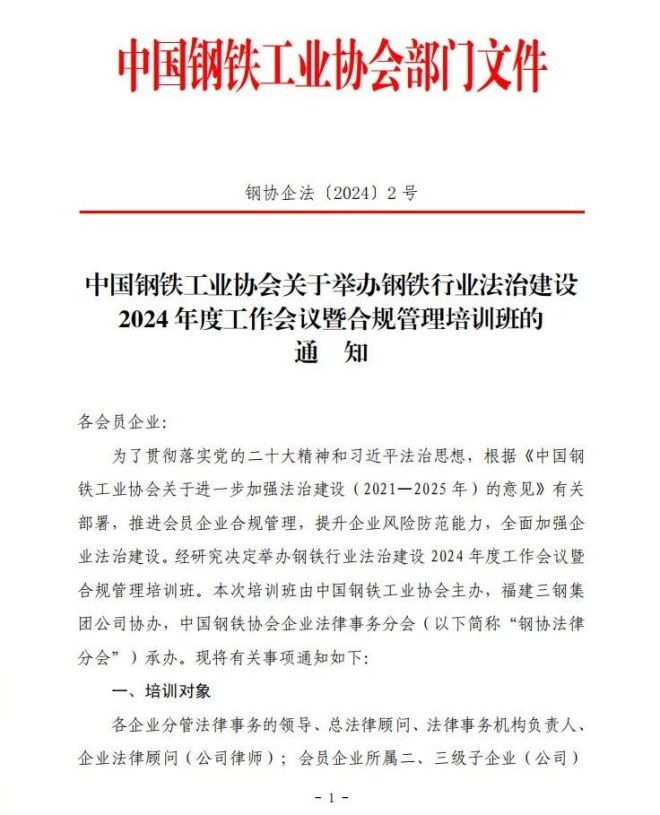 中國(guó)鋼鐵工業(yè)協(xié)會(huì)關(guān)于舉辦鋼鐵行業(yè)法治建設(shè)2024 年度工作會(huì)議暨合規(guī)管理培訓(xùn)班的通知