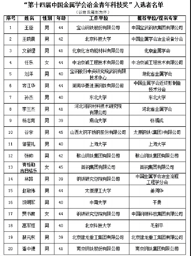 按照《中國金屬學會冶金青年科技獎獎勵章程》,第十四屆中國金屬學會冶金青年科技獎經單位推薦/專家提名、資格審查、初評、復評,最終有20名候選人入選。
