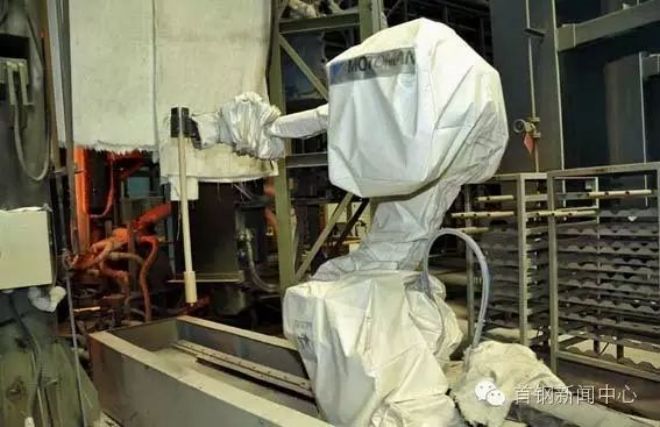 寶鋼股份寶山基地-3CC中間包機(jī)器人,不僅可以實(shí)現(xiàn)大包長(zhǎng)水口的安裝、拆卸與清洗作業(yè)等復(fù)雜動(dòng)作,還可以實(shí)現(xiàn)在中間包內(nèi)鋼水溫度的測(cè)量和取樣以及向中間包內(nèi)加覆蓋劑的功能,同時(shí)還配備了異常情況下的燒氧引流功能,屬于集多功能于一身的澆鋼配套機(jī)器人,完全取代了大包操作工的作業(yè)。