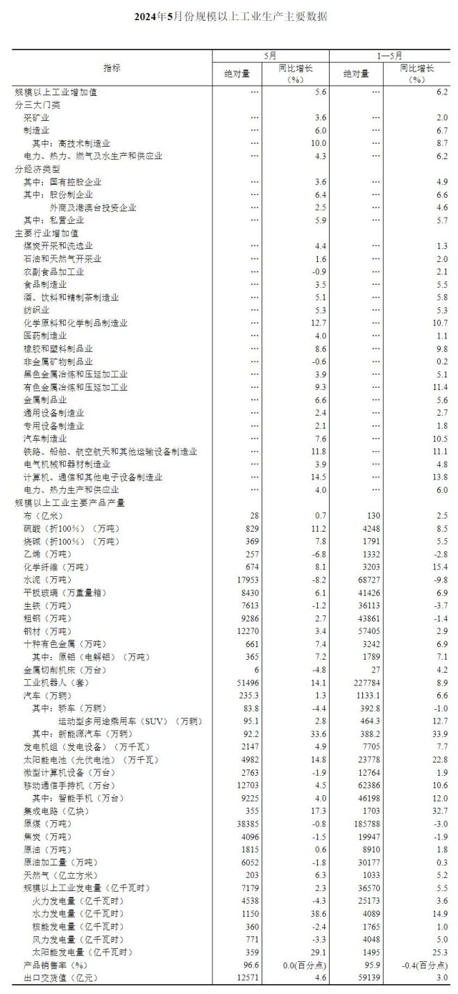 分產品看,5月份,619種產品中有352種產品產量同比增長。其中,鋼材12270萬噸,同比增長3.4%;水泥17953萬噸,下降8.2%;十種有色金屬661萬噸,增長7.4%;乙烯257萬噸,下降6.8%;汽車235.3萬輛,增長1.3%,其中新能源汽車92.2萬輛,增長33.6%;發電量7179億千瓦時,增長2.3%;原油加工量6052萬噸,下降1.8%。?