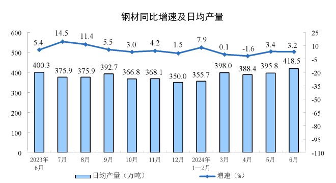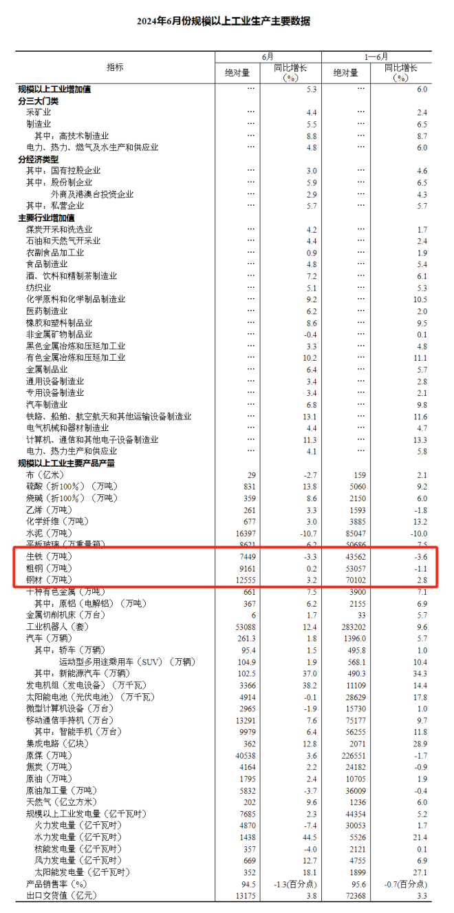 2024年6月份,我國鋼材產量12555萬噸,同比增長3.2%;1-6月份,我國鋼材產量70102萬噸,同比增長2.8%。