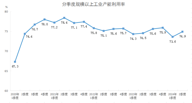2024年二季度,全國規模以上工業產能利用率為74.9%,比上年同期上升0.4個百分點,比一季度上升1.3個百分點。