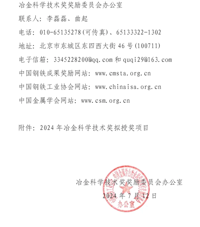 凡對公示項目有異議,或公布內容不準確的,請于2024年7月19日前與冶金科學技術獎獎勵委員會辦公室聯系。