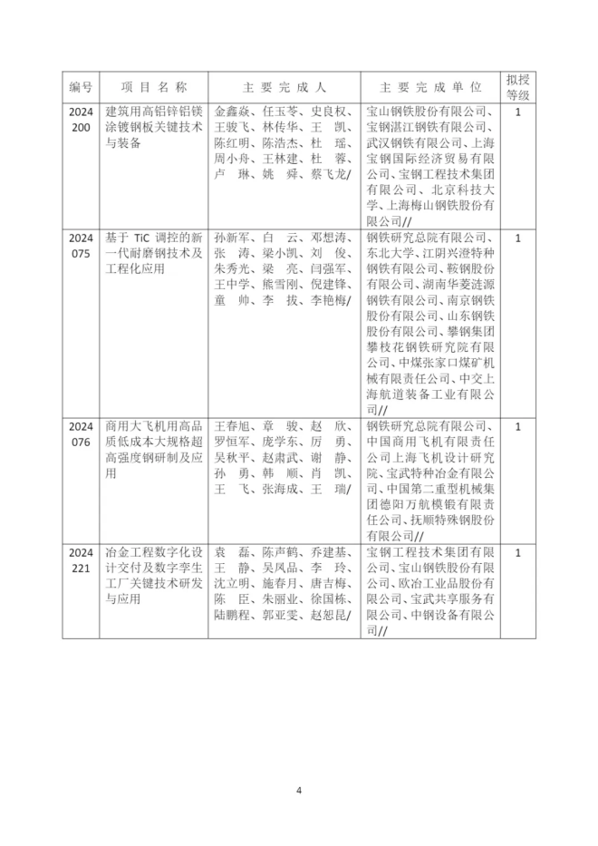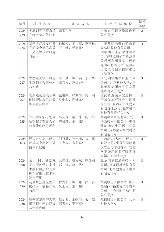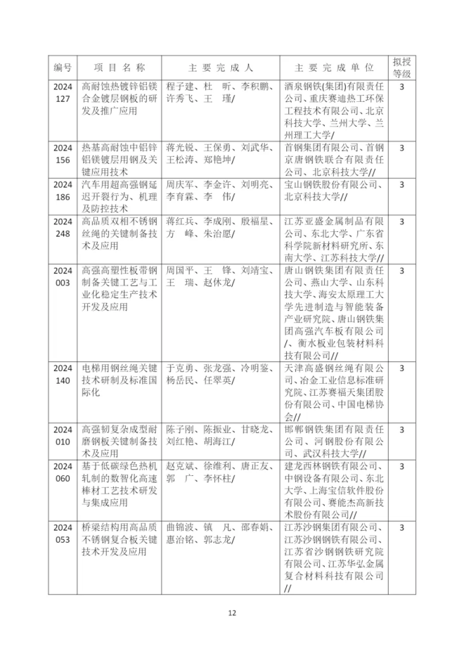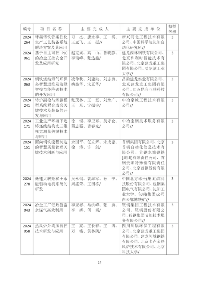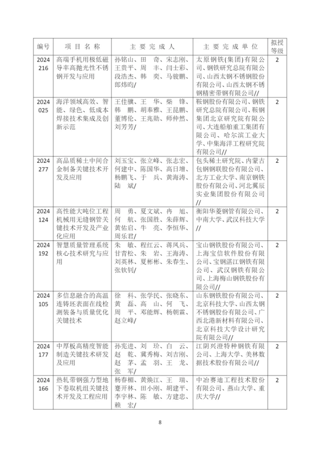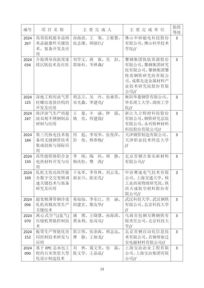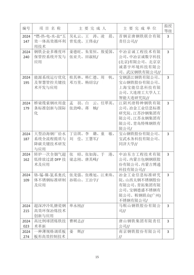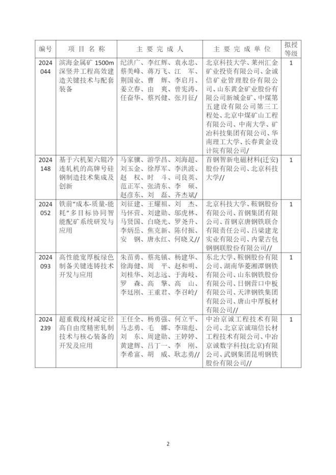 2024年中國鋼鐵工業協會、中國金屬學會冶金科學技術獎(簡稱冶金科學技術獎)評審委員會評審已經結束,擬授獎110項,其中:特等獎3項,一等獎21項,二等獎29項,三等獎57項。根據評審程序,現將評審委員會推薦獲獎項目向社會公告。