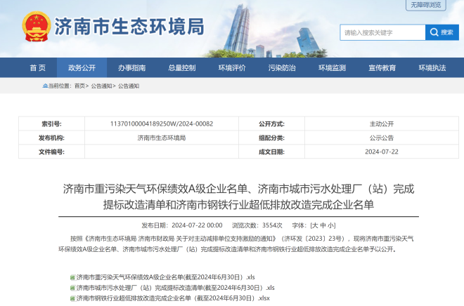 7月22日,濟(jì)南市生態(tài)環(huán)境局官網(wǎng)發(fā)布,濟(jì)南市重污染天氣環(huán)保績效A級企業(yè)名單、濟(jì)南市城市污水處理廠(站)完成提標(biāo)改造清單和濟(jì)南市鋼鐵行業(yè)超低排放改造完成企業(yè)名單。