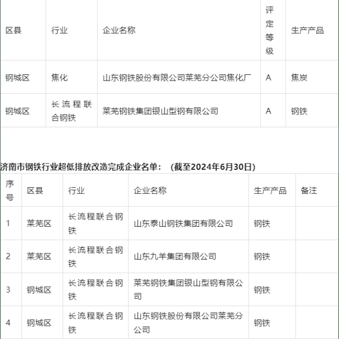 濟(jì)南市重污染天氣環(huán)保績效A級鋼鐵企業(yè)名單:(截至2024年6月30日)