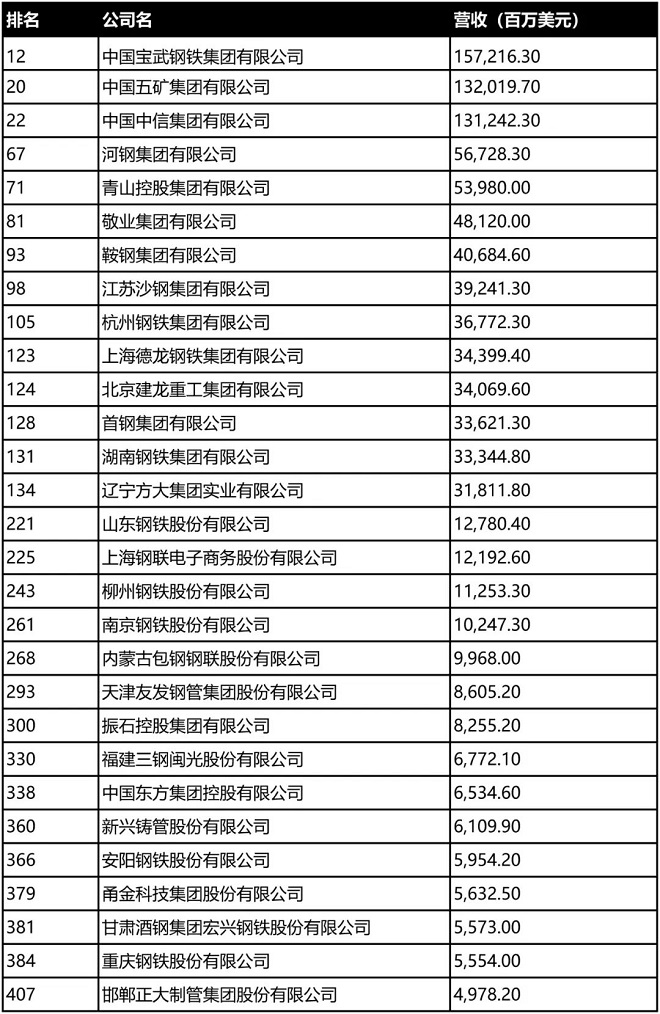 鋼鐵行業(yè)上榜企業(yè)名單