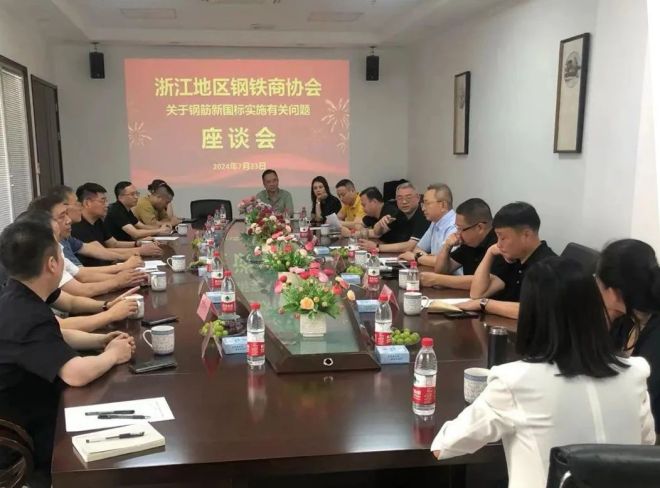 2024年7月23日上午,浙江地區鋼鐵商協會關于鋼筋新國標實施有關問題座談會在杭州恒山鋼鐵電商產業園8樓會議室召開。參加座談會的有:杭州鋼鐵貿易行業協會、寧波市鋼鐵行業協會、臺州市金屬材料流通行業協會、溫州市金屬行業協會、金華市鋼材行業協會、麗水市金屬行業協會以及杭州部分建材經銷企業的負責人。中國金屬材料流通協會執行會長兼秘書長陳雷鳴應邀參加了座談會并講話。會議由杭州鋼鐵貿易行業協會魏春全會長主持。