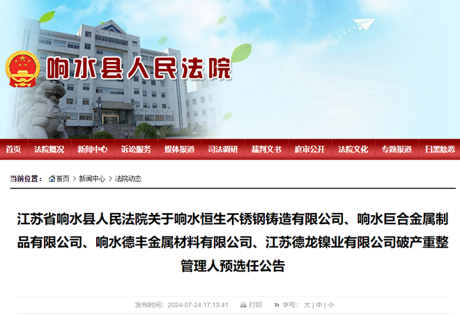 7月24日,江蘇省響水縣人民法院發(fā)布公告稱,已立案審查德龍鎳業(yè)、響水恒生不銹鋼鑄造有限公司、響水巨合金屬制品有限公司、響水德豐金屬材料有限公司四家公司破產重整案。法院尚未決定是否最終受理上述案件。