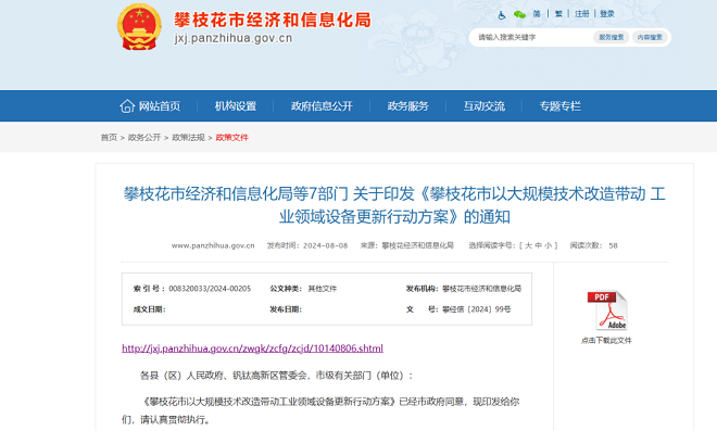 近日攀枝花市經濟和信息化局等7部門印發《 攀枝花市以大規模技術改造帶動工業領域設備更新行動方案》。方案提出以高端、智能、綠色、安全為主要方向,加快實施工業領域大規模設備更新和技術改造。