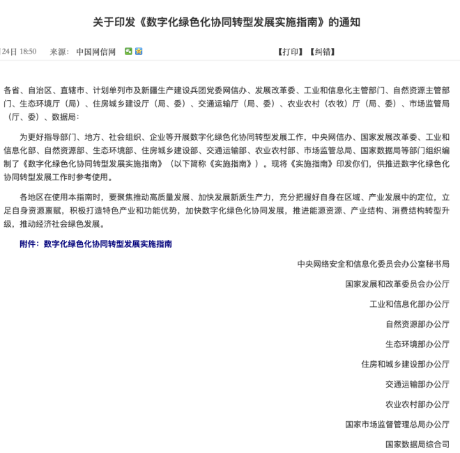 近日,中央網(wǎng)信辦等十部門秘書(shū)局(辦公廳、綜合司)聯(lián)合印發(fā)《數(shù)字化綠色化協(xié)同轉(zhuǎn)型發(fā)展實(shí)施指南》(以下簡(jiǎn)稱《實(shí)施指南》),實(shí)施指南明確了推動(dòng)數(shù)字產(chǎn)業(yè)綠色低碳發(fā)展、加快數(shù)字技術(shù)賦能行業(yè)綠色化轉(zhuǎn)型等雙化協(xié)同兩大發(fā)力方向。
