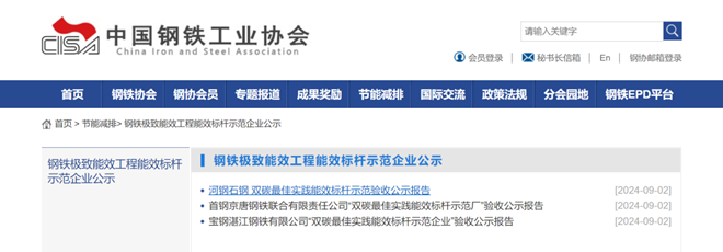9月2日,寶鋼湛江鋼鐵、首鋼京唐鋼鐵、河鋼石家莊鋼鐵(短流程電爐煉鋼)極致能效工程能效標(biāo)桿企業(yè)正式公示。前期經(jīng)企業(yè)自評(píng)估,中國(guó)鋼鐵工業(yè)協(xié)會(huì)組織形式審查與書(shū)面評(píng)審,及組織專(zhuān)家對(duì)三家鋼鐵企業(yè)進(jìn)行現(xiàn)場(chǎng)驗(yàn)收,已具備公示條件,已正式于鋼協(xié)網(wǎng)站公示。