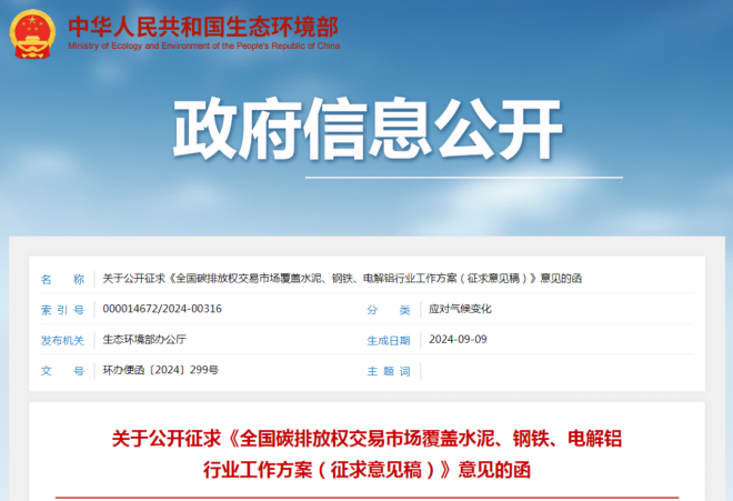 9月9日,生態環境部發布了《全國碳排放權交易市場覆蓋水泥、鋼鐵、電解鋁行業工作方案(征求意見稿)》(以下簡稱“方案”)。