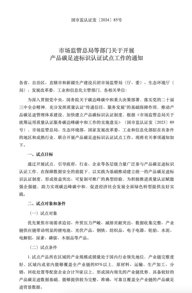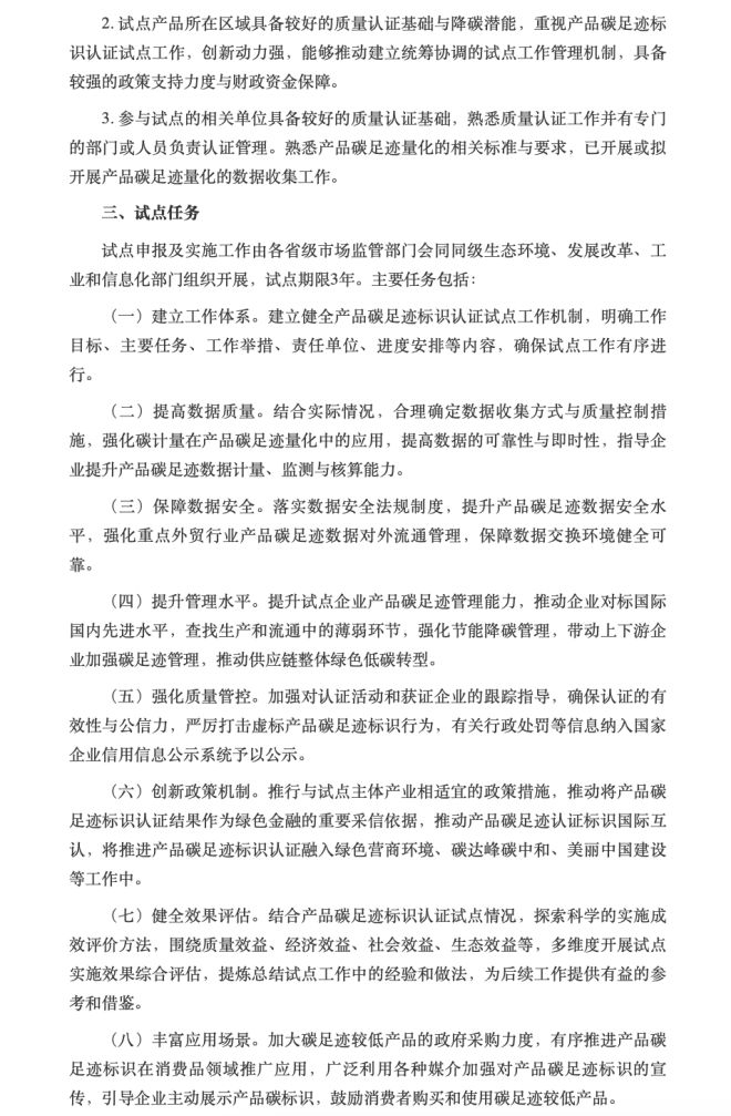 《通知》要求,試點產品所在區域的產業規模或銷量處于國內行業領先地位,產業鏈完整度好,區域內或省內能夠覆蓋全產業鏈的85%以上,原材料、運輸、生產加工、分銷、回收處置等配套企業合計70家以上,形成國內領先的產業鏈優勢,具備較好的產品碳足跡數據基礎,能夠提供較為完整、準確、可靠且覆蓋全產業鏈的產品碳足跡背景數據。各省份申報試點產品不超過2個。本次試點申報及實施工作由各省級市場監管部門會同同級生態環境、發展改革、工業和信息化部門組織開展,試點期限3年。有意愿的省級市場監管部門會同有關部門根據試點條件確定試點產品,于2024年9月30日前完成相關報送工作。