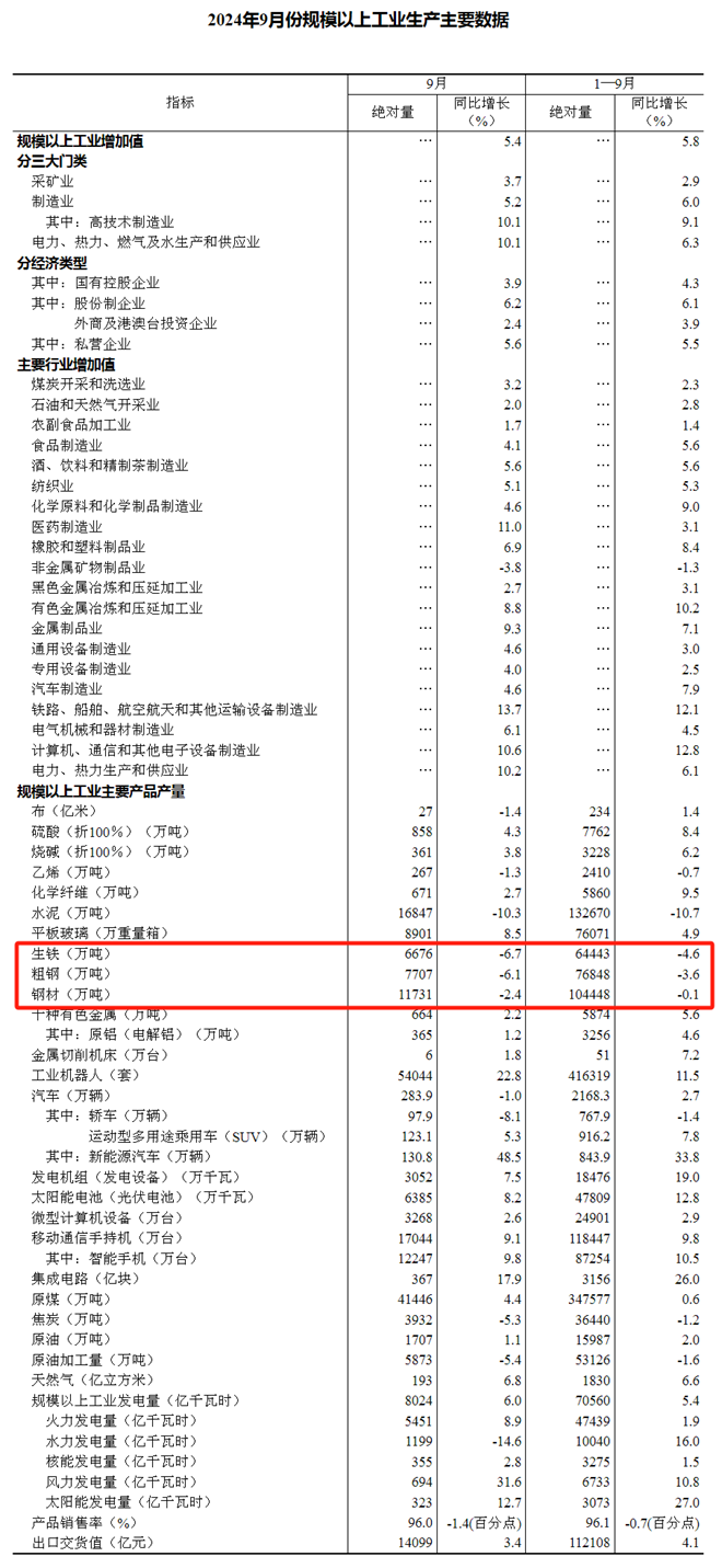 2024年9月份,我國(guó)鋼材產(chǎn)量11731萬(wàn)噸,同比下降2.4%;1-9月份,我國(guó)鋼材產(chǎn)量104448萬(wàn)噸,同比降低0.1%。