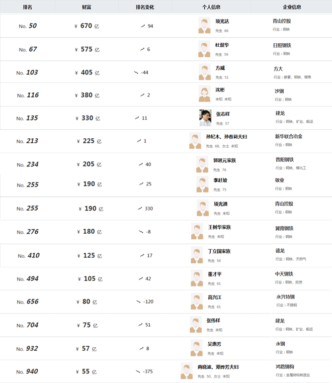 據(jù)統(tǒng)計(jì),鋼鐵相關(guān)行業(yè)企業(yè)家上榜情況如下: