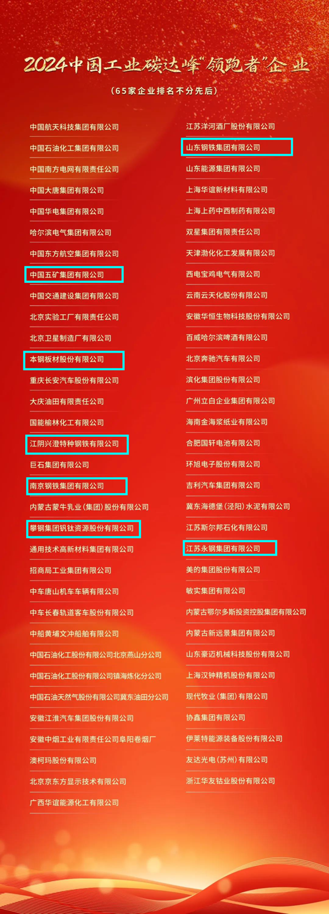 11月30日,中國工業經濟聯合會在第三屆中國工業碳達峰論壇上發布了2024中國工業碳達峰“領跑者”企業,共有65家堅守行業綠色低碳發展使命,勇擔工業綠色低碳轉型重任的優秀企業成為中國工業碳達峰“領跑者”企業,其中更包含山東鋼鐵、中國五礦、本鋼板材、興澄特鋼、南京鋼鐵、攀鋼釩鈦、永鋼集團(排名不分先后)等多個鋼鐵企業。