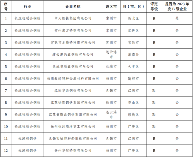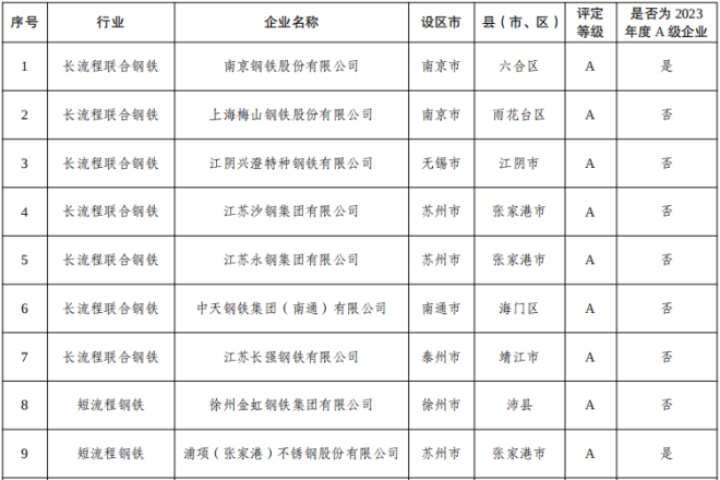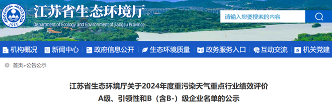 江蘇省生態(tài)環(huán)境廳關(guān)于2024年度重污染天氣重點行業(yè)績效評價A級、引領(lǐng)性和B(含B-)級企業(yè)名單的公示