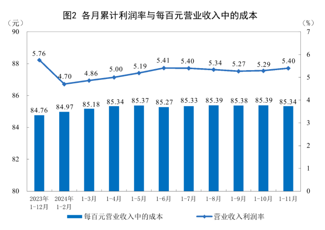 1—11月份,規模以上工業企業每百元營業收入中的成本為85.34元,同比增加0.37元;每百元營業收入中的費用為8.40元,同比增加0.02元。