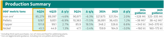 2024年,淡水河谷鎳產量有所下降,主要因為薩德伯里礦區三季度維護后鎳庫存減少,以及翁卡普馬礦區在去年10 月遭遇強風暴后電力中斷,產量有所下降。