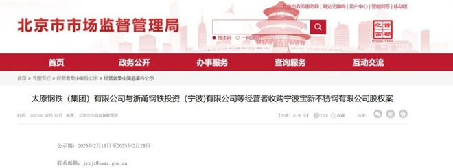 近日,北京市市場(chǎng)監(jiān)督管理局發(fā)布《太原鋼鐵(集團(tuán))有限公司與浙甬鋼鐵投資(寧波)有限公司等經(jīng)營(yíng)者收購(gòu)寧波寶新不銹鋼有限公司股權(quán)案》公示。