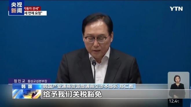 韓國(guó)產(chǎn)業(yè)通商資源部通商交涉本部長(zhǎng) 鄭仁教:我們已向美國(guó)貿(mào)易代表辦公室提出要求,給予我們關(guān)稅豁免,或者至少給予我們非歧視待遇。