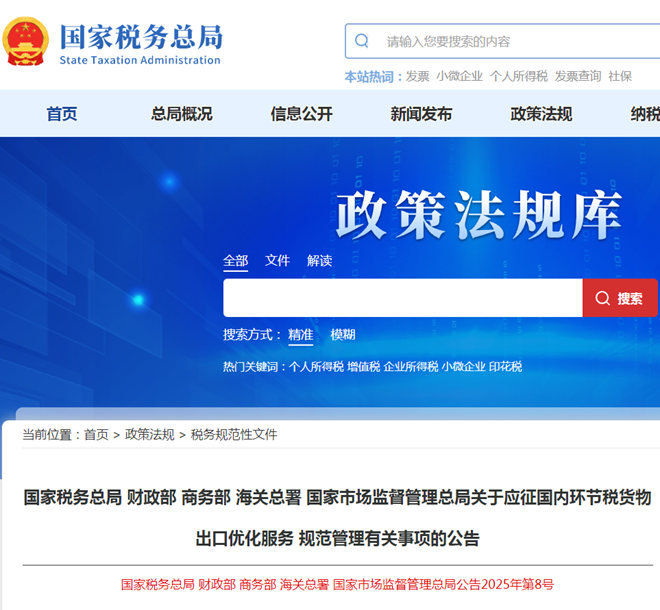 近日,國家稅務總局、財政部、商務部、海關總署以及國家市場監(jiān)督管理總局五大部門聯(lián)合發(fā)布了《關于應征國內環(huán)節(jié)稅貨物出口優(yōu)化服務 規(guī)范管理有關事項的公告》。