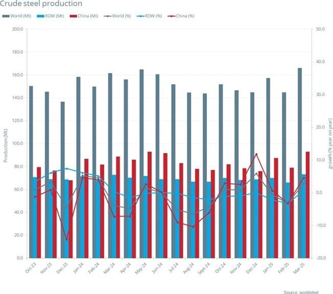 2025年3月全球69個納入世界鋼鐵協會統計國家/地區的粗鋼產量為1.661億噸,同比提高2.9%。