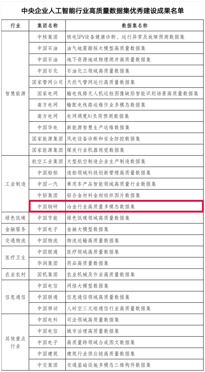 名單中,中國(guó)鋼研 ——《冶金行業(yè)高質(zhì)量多模態(tài)數(shù)據(jù)集》入選。