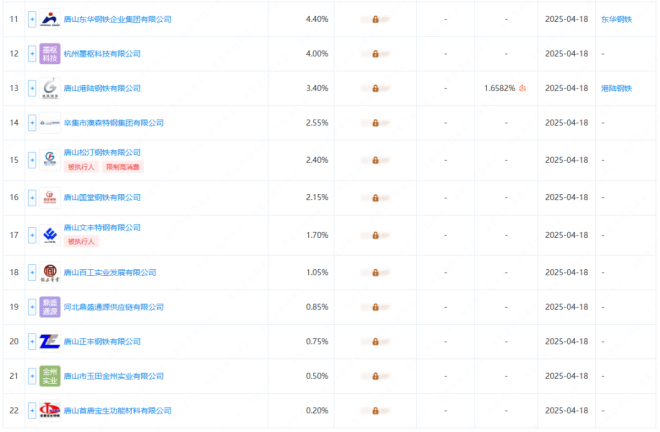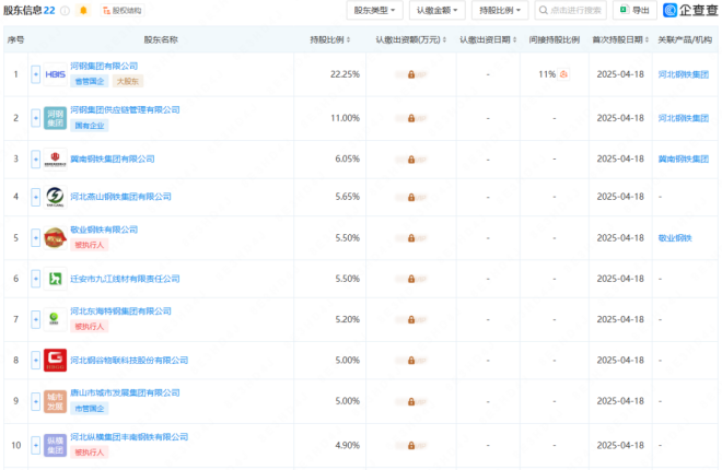 19家鋼鐵企業(yè)分別為:河鋼集團(tuán)有限公司(占股22.25%)、河鋼集團(tuán)供應(yīng)鏈管理有限公司(占股11.00%)、冀南鋼鐵集團(tuán)有限公司、河北燕山鋼鐵集團(tuán)有限公司、敬業(yè)鋼鐵有限公司、遷安市九江線材有限責(zé)任公司、河北東海特鋼集團(tuán)有限公司、河北鋼谷物聯(lián)科技股份有限公司、河北縱橫集團(tuán)豐南鋼鐵有限公司、唐山東華鋼鐵企業(yè)集團(tuán)有限公司、唐山港陸鋼鐵有限公司、辛集市澳森特鋼集團(tuán)有限公司、唐山松汀鋼鐵有限公司、唐山國堂鋼鐵有限公司、唐山文豐特鋼有限公司、唐山百工實(shí)業(yè)發(fā)展有限公司、唐山正豐鋼鐵有限公司、唐山市玉田金州實(shí)業(yè)有限公司、唐山首唐寶生功能材料有限公司。
