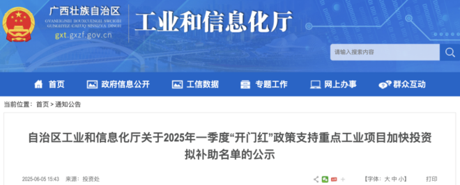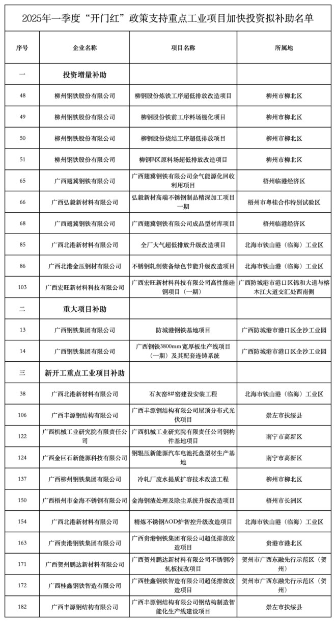 日前,廣西壯族自治區(qū)工業(yè)和信息化廳公布2025年一季度“開門紅”政策支持重點工業(yè)項目加快投資擬補助名單。