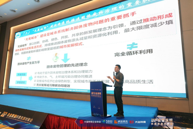 生態環境部危廢管理中心專家楊強威系統闡釋了“無廢集團”建設的政策框架與實施路徑,并結合典型案例分享減廢降碳的實踐經驗,為企業推進綠色轉型提供了極具價值的指導。他提出,對固廢產生量大、種類復雜且環境風險可控的大型國企,給予 “白名單”“點對點” 等政策優惠,支持其開展 “無廢集團” 建設,降低成本、提高效益;借助大企業優勢加強省際及城市間聯系,互鑒經驗,補充 “無廢城市” 建設;組織行業龍頭制定固廢資源化利用行業標準,規范市場運行,推動良性競爭,引領高質量發展。