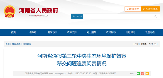 6月13日,河南省人民政府網(wǎng)站發(fā)布《河南省通報(bào)第三輪中央生態(tài)環(huán)境保護(hù)督察移交問題追責(zé)問責(zé)情況》一文。