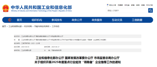 近日,工業和信息化部、國家發展改革委、市場監管總局等三部門印發通知,部署開展2025年度重點行業能效“領跑者”企業推薦工作。