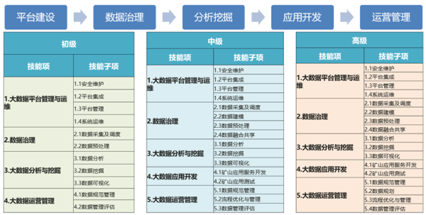 《評價規范》共劃分了4個職業方向,初級對應3個方向,中高級對應4個方向。其中,礦山大數據運維方向的職業功能(技能項)包括大數據平臺管理與運維和大數據運營管理,礦山大數據治理方向的職業功能包括數據治理和大數據運營管理,礦山大數據分析與挖掘方向的職業功能包括大數據分析與挖掘和大數據運營管理,大數據應用開發方向的職業功能包括大數據應用開發和大數據運營管理。