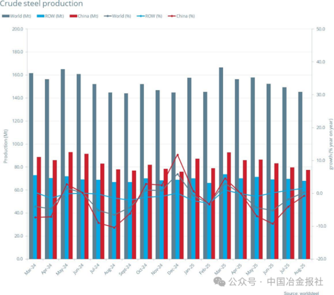 2025年8月全球70個納入世界鋼鐵協會統計國家/地區的粗鋼產量為1.453億噸,同比提高0.3%。
