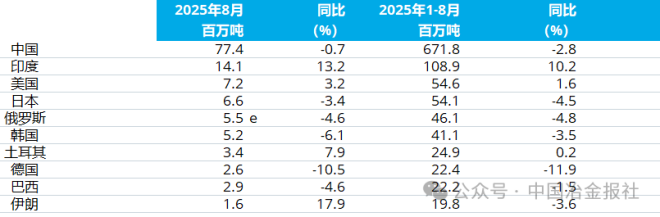 2025年8月全球70個納入世界鋼鐵協會統計國家/地區的粗鋼產量為1.453億噸,同比提高0.3%