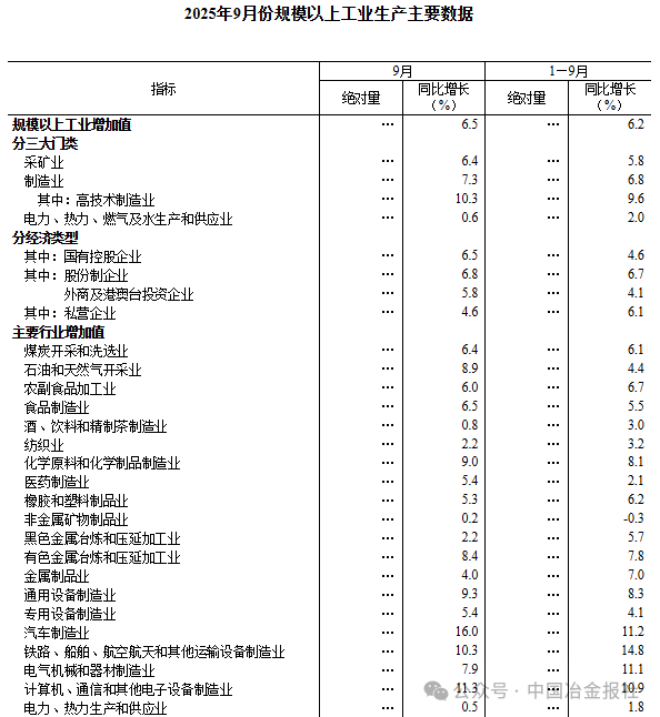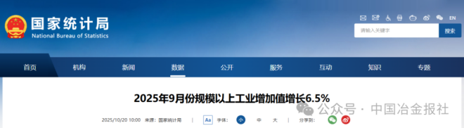 10月20日,國家統計局網站發布《2025年9月份規模以上工業增加值增長6.5%》一文。