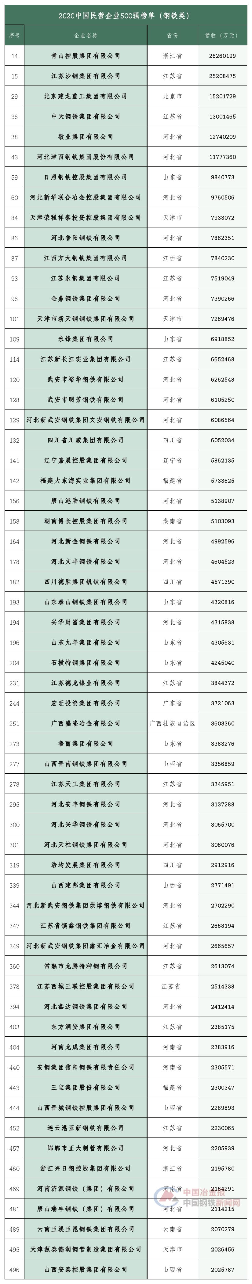 61家鋼企上榜2020中國民營企業(yè)500強!