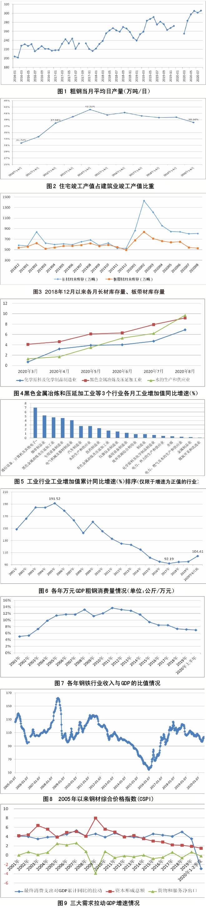 2020年,中國受到新冠肺炎疫情的沖擊;自3月份起,境外新冠肺炎疫情開始擴(kuò)散蔓延,對全球的社會(huì)、生活和經(jīng)濟(jì)運(yùn)行產(chǎn)生了巨大影響,全球范圍內(nèi)的產(chǎn)業(yè)鏈、供應(yīng)鏈均受到?jīng)_擊。此時(shí),中國通過加大固定資產(chǎn)投資、強(qiáng)化國內(nèi)經(jīng)濟(jì)循環(huán)以應(yīng)對新冠肺炎疫情的沖擊,不失為發(fā)展經(jīng)濟(jì)的良策。2020年上半年,資本形成總額拉動(dòng)GDP增長1.5個(gè)百分點(diǎn),最終消費(fèi)支出拉動(dòng)GDP下降了2.9個(gè)百分點(diǎn),資本形成總額拉動(dòng)GDP增長幅度比最終消費(fèi)支出高出4.41個(gè)百分點(diǎn),為2001年以來二者之間最大差值。這一方面表明固定資產(chǎn)投資對第二季度GDP增長有著巨大拉動(dòng)作用,另一方面表明2020年鋼鐵行業(yè)通過支撐固定資產(chǎn)投資需求支撐著中國經(jīng)濟(jì)的快速復(fù)蘇。