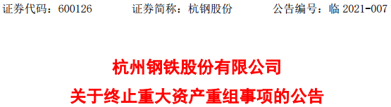 2021年2月7日,杭州鋼鐵股份有限公司召開第八屆董事會(huì)第八次會(huì)議,審議通過了《關(guān)于終止重大資產(chǎn)重組事項(xiàng) 并撤回相關(guān)申請(qǐng)材料的議案》, 同意杭鋼股份公司終止發(fā)行股份及支付現(xiàn)金購買資產(chǎn)暨關(guān)聯(lián)交易(以下簡(jiǎn)稱“本次重組”或“本次交易”)事項(xiàng)及簽署本次交易的終止協(xié)議,并向中國證券監(jiān)督管理委員會(huì)(以下簡(jiǎn)稱“中國證監(jiān)會(huì)”)申請(qǐng)撤回相關(guān)文件。