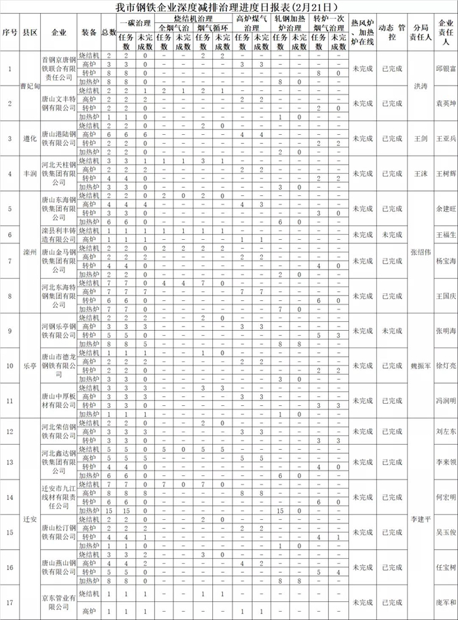 唐山市鋼鐵企業(yè)深度減排治理進(jìn)度日報表