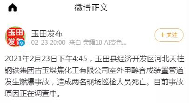 據(jù)玉田發(fā)布微博消息,2月23日下午4:45,玉田縣經(jīng)濟開發(fā)區(qū)河北天柱鋼鐵集團古玉煤焦化工有限公司室外甲醇合成裝置管道發(fā)生燃爆,事故造成兩名現(xiàn)場巡檢人員死亡。目前事故原因正在調(diào)查中。